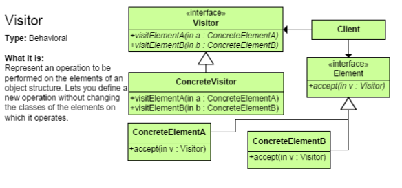 - 객체 구조에 속한 요소에 수행될 오퍼레이션을 정의하는 객체이다. Visitor 패턴은 처리되어야 하는 요소에 대한 클래스를 변경하지 않고 새로운 오퍼레이션을 정의할 수 있게 한다