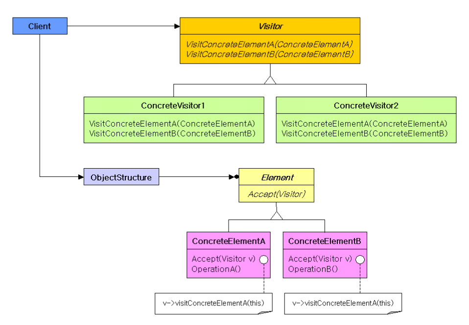 - Element: 아규먼트로 Visitor 클래스를 받아들이는 Accept() 오퍼레이션을 정의한다.
