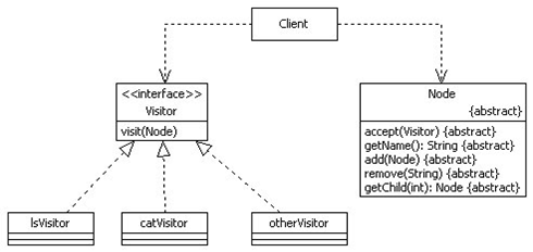 - 오퍼레이션 들이 여러 노드 클래스에 걸쳐 분산되어 있어서 시스템의 이해 및 변경, 유지보수를 어렵게 만든다. 이때 각 클래스의 관련된 오퍼레이션을 모아 Visitor라는 별도의 클래스를 만들고 이를 추상 구문 트리의 원소 클래스를 알아낸다. 아규먼트로 원소를 포함한다.