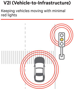- 차량과 인프라, 즉 도로 시설과 도로 관련 정보나 경고, 신호 등에 대한 정보를 주고 받는 기술 |