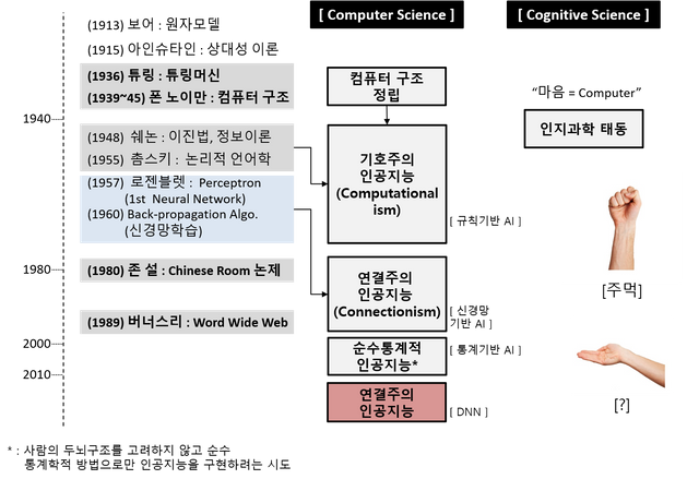 - - 앨런 튜링의 1950년대 학습하는 기계로 시작된 인공지능은 데이터 기반 지식의 전문가 시스템, 이후 자연을 모방안 뉴럴 네트워크, 유전 알고리즘, 머신러닝, 딥러닝으로 발전하고 있음