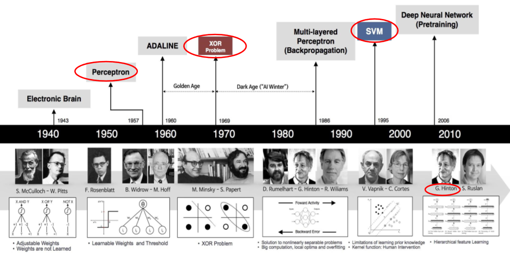 - 기본 구조상 문제점(퍼셉트론 한계)→ ‘80년대 다층퍼셉트론 도입/문제 해결