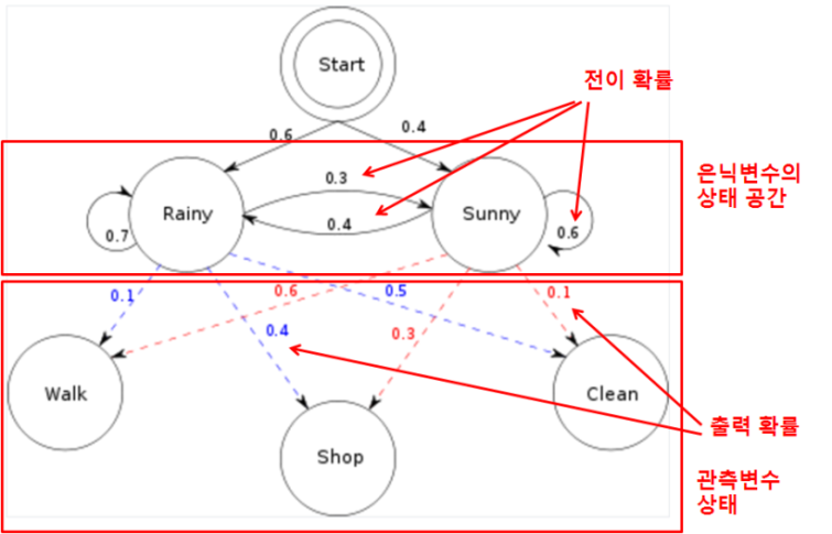 - **은닉 상태**: 상태를 직접적으로 볼 수 없고 상태들로부터 야기된 결과들만을 관찰 가능