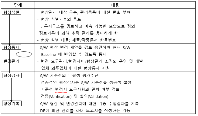 - S/W를 이루는 부품의 Baseline(변경통제 시점)을 정하고 변경을 철저히 관리 통제하는 활동