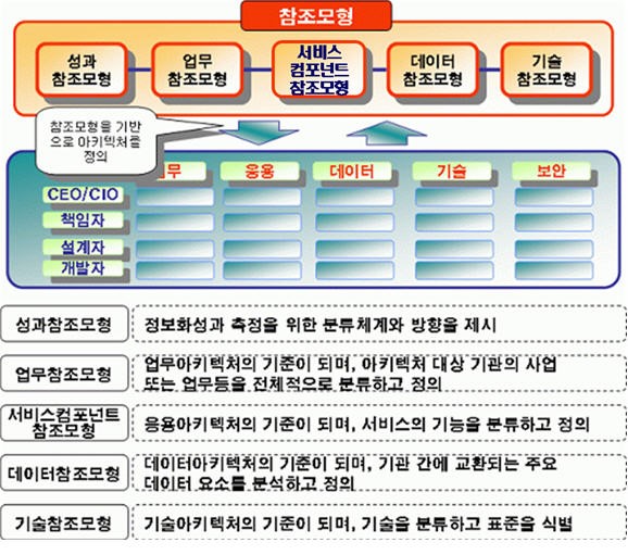 - 공공기관은 참조모형(RM)을 통하여 전체 정보자원에 대한 구조적 관점 제공, 조직의 정보자원 중복요소 파악, 관련기관 간의 아키텍처 비교․분석, 정보공동 활용을 위한 상호운용성 확보, 조직의 정보자원관리 표준화, 공통서비스 발견을 지원