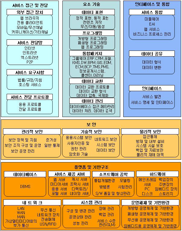 시스템적으로 서비스(서비스 컴포넌트)를 구현하는데 필요한소프트웨어 요소 기술 분야를 의미한다. |