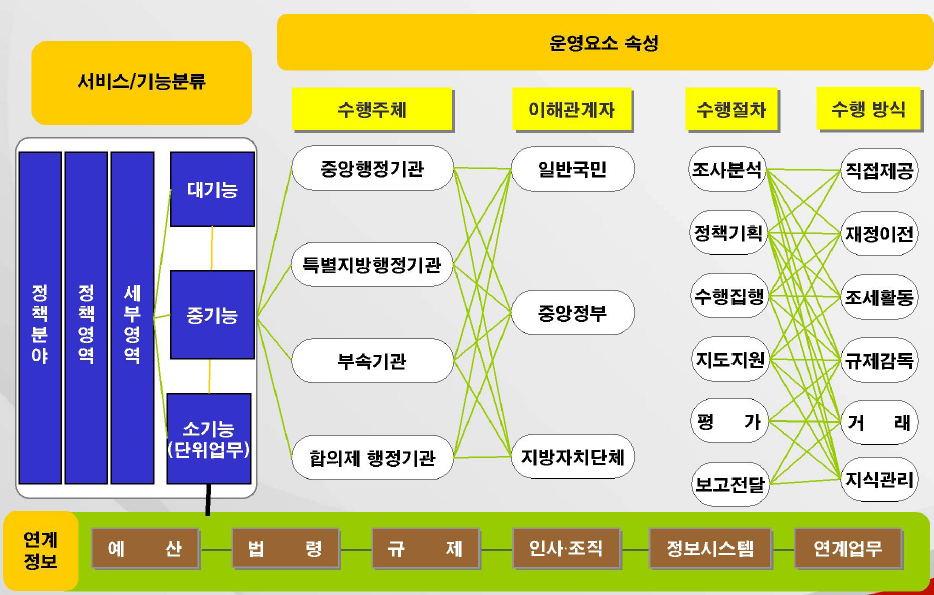 - 개별기관의 임무수행과 독립적으로 연방 정부차원의 업무운영을 설명하기위한 기능 중심의 엄무기능 분류
