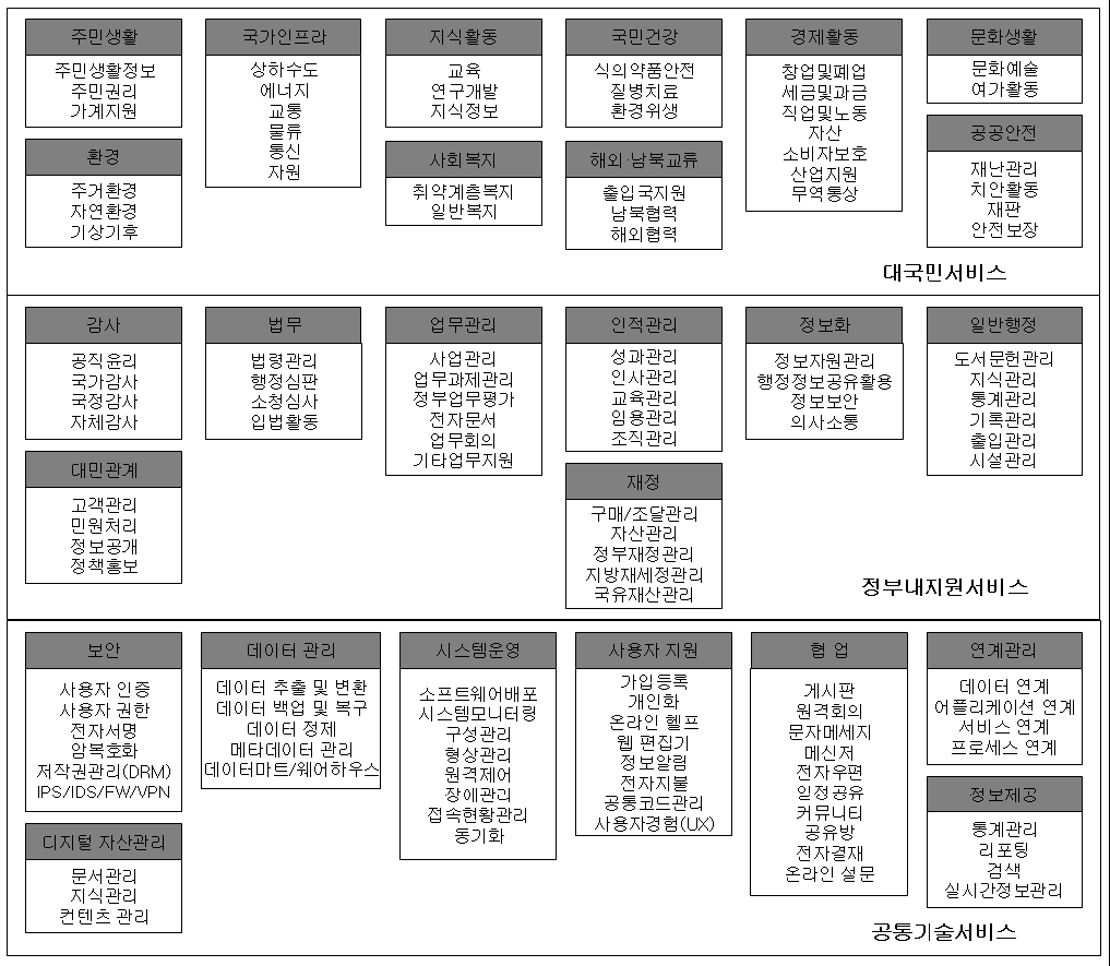 다수의 기관에서 공통으로 사용되고 통합된 환경으로 제공 관리 할 수 있는 응용 서비스 컴포넌트의 집합 자산관리,재무,회계,인적자원관리, 사업관리, 성과관리와 같은 서비스 |