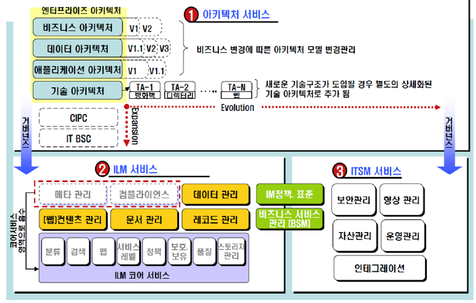 -ILM 서비스는 아키텍처 서비스를 통해 구축된 정보시스템 프레임웍에 기업활동에서 발생되는다양한 데이터를 수명주기 관점에서 일관되게 저장. 활용 및 관리하는 핵심 서비스 제공