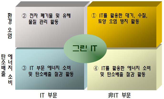 - 최근 기후변화와 고유가가 글로벌 이슈로 떠오르면서 IT 부문의 에너지 절감 및 CO2 배출 감소 활동을 뜻하는 용어로 주로 사용
