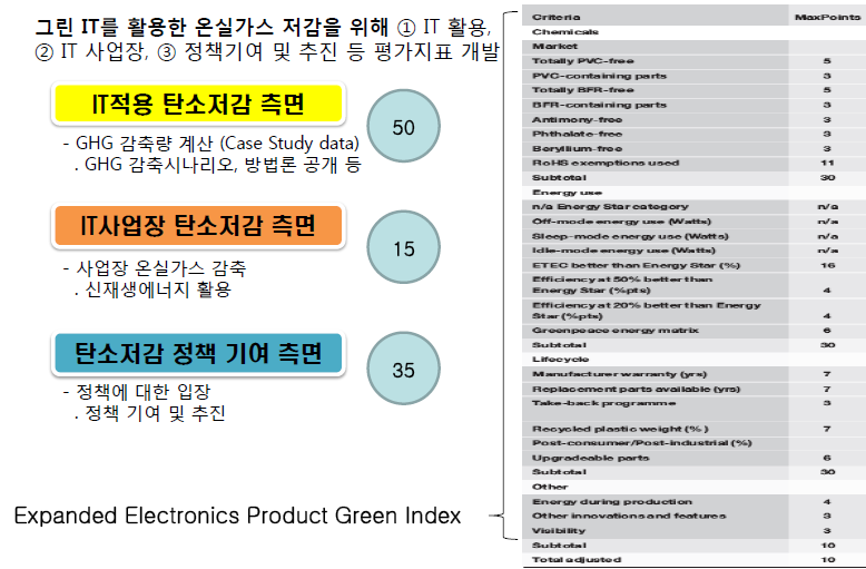 - - 단순히 IT제품과 기술의 그린화를 뛰어넘어 IT를 녹색 성장전략에 어느 정도 활용하고, 얼마나 잘 활용하는지를 체계적으로 측정해 그린 IT로 인한 생산성 향상을 평가할 수 있는 지표 - 기업ㆍ기관의 그린IT 활용을 평가하는 지수