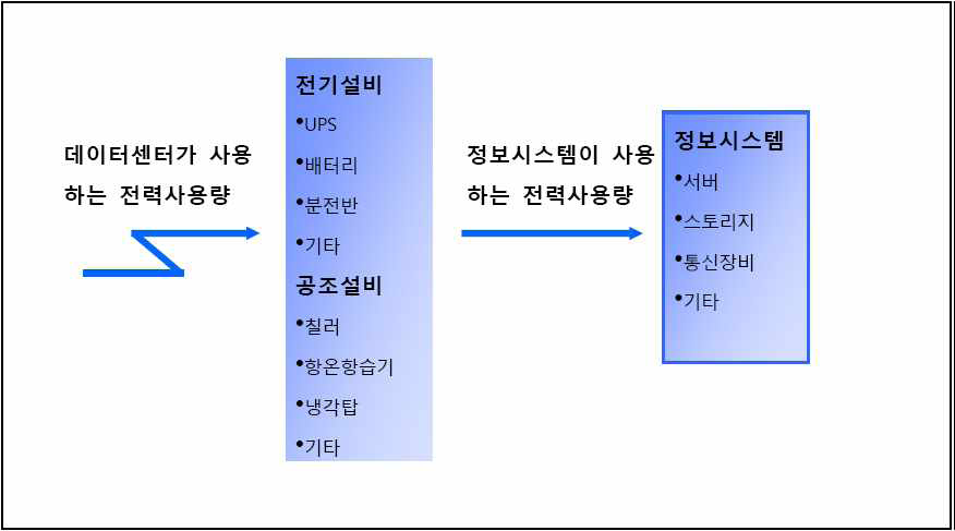 - PUE = 데이터센터의 전체 전력량/정보시스템의 전력량 = Total facility power / IT equipment power