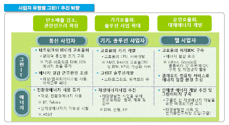 가. 그린화를 추구하는 IT 사업자들은 단기적으로는 각자의 사업영역에서 효율화를 추구하고 구체적인 탄소배출 감소방안을 마련하여 시행하고 있으며, 장기적인 관점에서 대체 에너지 개발에 관심
