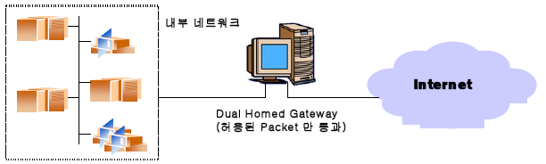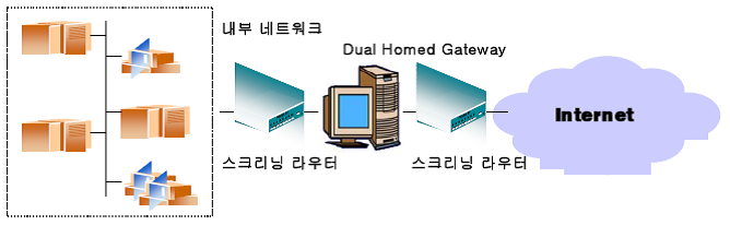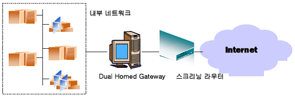 - 하나의 네트워크 인터페이스는 인터넷 등 외부 네트워크에 연결되며, 다른 하나의 네트워크 인터페이스는 내부 네트워크에 연결되는 Bastion 호스트 - 내외부용 2개의 네트워크 카드를 내장한 Bastion Host를 이용하여 연결 - 라우팅 기능은 존재하지 않음 - 외부 네트워크에서 내부 네트워크로 진입하기 위해서는 Dual-Homed Gateway를 통과하며 허용된 패킷만을 통과시킴 |