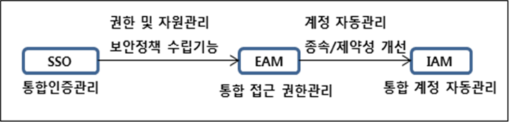 - EAM = SSO + 권한관리 + 자원관리 기능 + 보안정책 수립 지원 기능