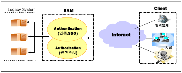 - EAM (Extranet/Enterprise Access Management)의 정의 - 전사적으로 산재되어 있는 각종 시스템의 사용자 인증 및 권한 관리를 통합적으로 수행할 수 있는 통합보안 관리 시스템. - EAM = SSO + 권한관리 + 자원관리 기능 + 보안정책 수립 지원 기능