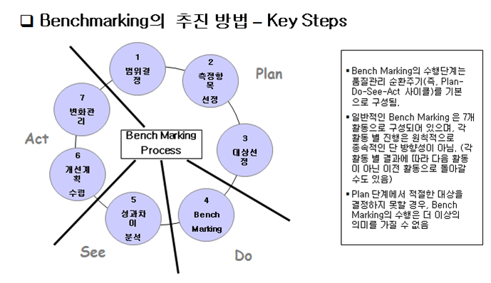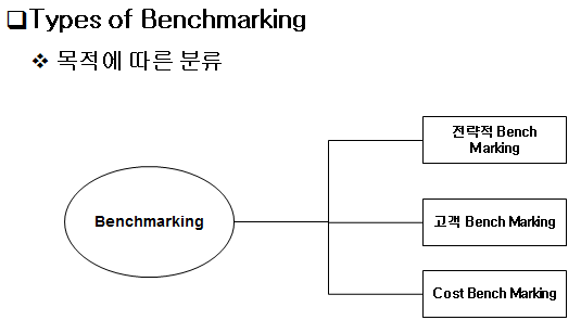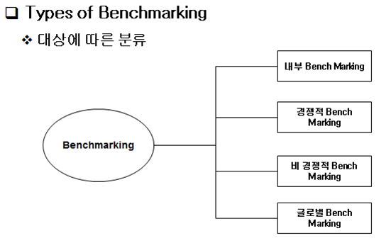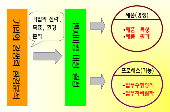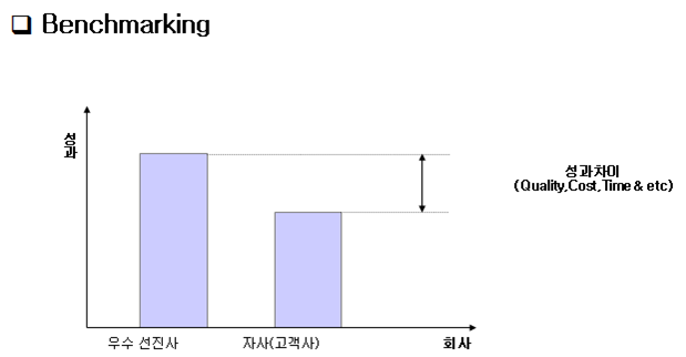 - 특정 분야에서 우수한 상대를 표적으로 자기 기업과의 성과 차이를 비교하고, 그들의 운영 프로세스를 배우면서 혁신을 추구하는 경영기법