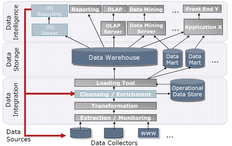 - - 수년간의 기업의 운영계 시스템에서 발생한 내부 데이터와 외부 데이터를 주제별로 통합하여 별도의 프로그래밍 없이 즉시 여러 각도에서 분석할 수 있도록 하는 통합시스템 - 데이터 웨어하우징(Data Warehousing)은 데이터의 수집 및 처리에서 도출되는 정보의 활용에 이르는 일련의 프로세스