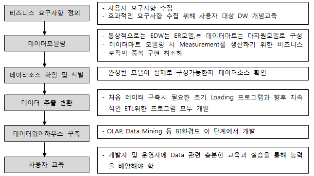 - 나선형방법론 적용: 데이터웨어하우스 프로젝트가 수행되는 동안 모든 비즈니스 요구사항을 취합하는 것은 불가능, 팀 조직화에 세심한 주의를 기울이며 반복적으로 구축