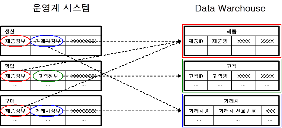 - 운영계 시스템의 생산, 영업, 구매 테이블에 제품, 거래처, 고객 등의 중복되는 데이터를 Data Warehouse 는 하나의 주제 영역으로 분리하여 데이터를 관리함