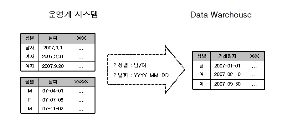 - 운영계 시스템의 데이터 성별이 남자/여자 또는 M/F등 정보마다 각기 다르고, 날짜 형식 또한 다양하여 통일된 형식으로 변환시켜 Data Warehouse에 적재시킴