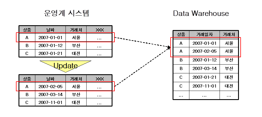 - 운영계 시스템 데이터는 Update 가 일어나면 기존 데이터는 지워지지만, Data Warehouse에서는 각 시점에 있던 데이터를 모두 저장함
