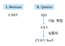 ID3라는 이름의 알고리즘으로 만들어 졌다가 1993년에 C4.5를 거쳐 1998년에 완성된 알고리즘으로 명목형 목표변수만을 지원하는 단점이 있는 반면에 가장 정확한 분류를 만들어 주는 알고리즘으로 평가됨 |
