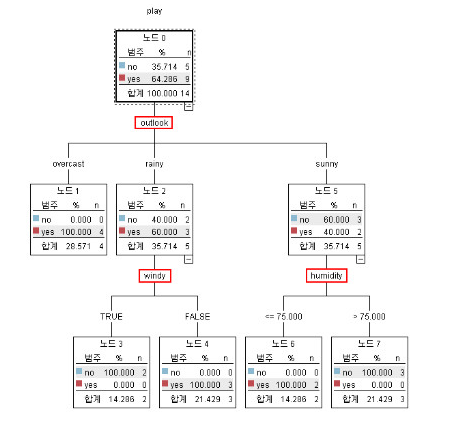 날씨가 맑고(outlook=sunny) 습도가 낮으면(humidity=low) 운동을 한다. (play=yes)