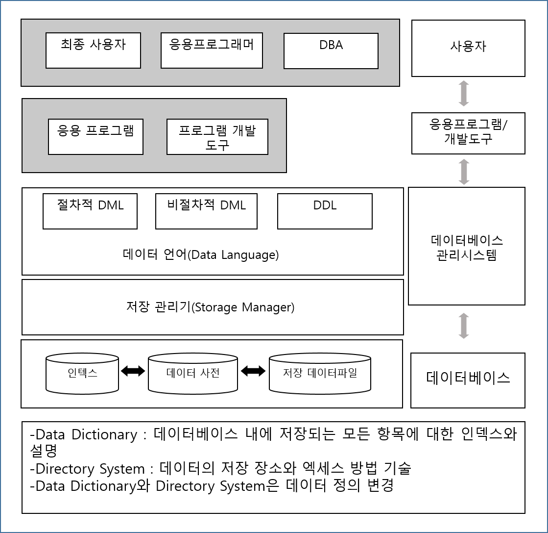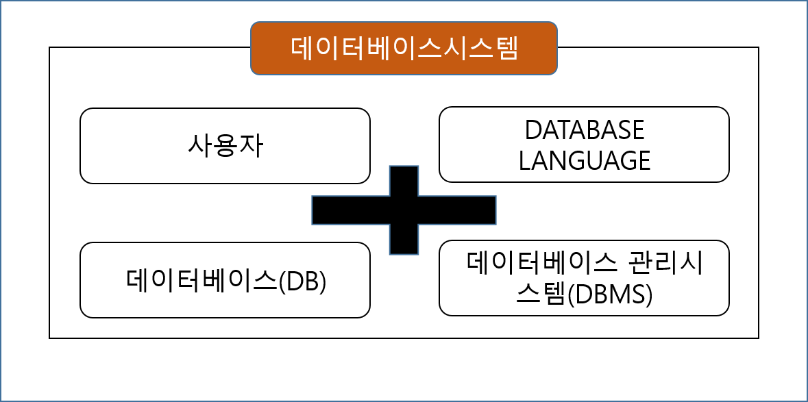 - 데이터를 Database에 저장하고, 관리해서 필요한 정보를 생성하는 컴퓨터 중심의 시스템. 사용자, Database Language, 데이터베이스(DB), 데이터베이스 관리시스팀(DBMS)로 이루어져 있음