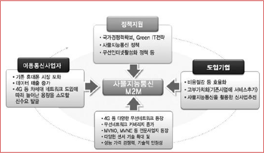 - - 기계 간의 통신(Machine to Machine) 및 사람이 동작하는 디바이스와 기계간의 통신(Mat to Machine) 으로 통신과 ICT 기술을 결합하여 원격지의 사물정보를 확인할 수 있는 인프라, 시스템 단말(기기)등 모든 제반 솔루션