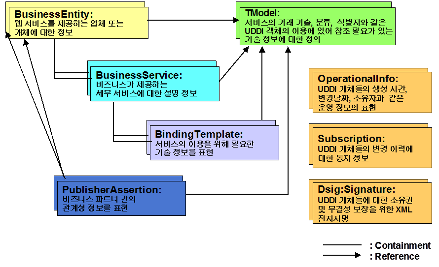 - UDDI(Universal Description, Discovery and Integration) 정의 - 웹 서비스에 대한 정보를 게시하고 검색하여 목록을 제공하는 역할을 수행하는 구조화된 방법의 XML기반 레지스트리
