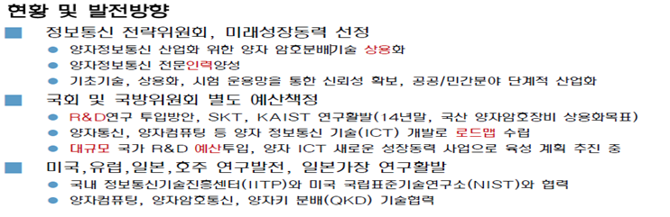 - 도청이슈, 해킹기술발전으로 기존 암호키의 보안강도 무력화, 양자산업을 국가 먹거리로 확보전략