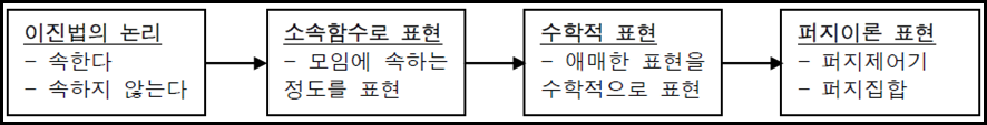 - 각 대상이 어떤 모임에 속한다 또는 속하지 않는다는 이진법 논리로부터, 각 대상이 그 모임에 속하는 정도를 소속함수(membership function)로 나타냄으로써 수학적으로 표현