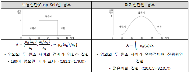 - 기존의 집합이론은 원소 x가 집합 A에 속할 때는 1의 값을 속하지 않을 때는 0의 값을 갖는 경계가 분명한 집합으로 구성되지만 퍼지 집합은 원소가 집합에 속하는 정도를 0과 1사이의 값 즉 [0,1]로 나타냄