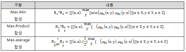 - 일반적으로 많이 사용되는 합성의 종류는 Max-Min 합성, Max- Product 합성, Max-average 합성 등이 존재